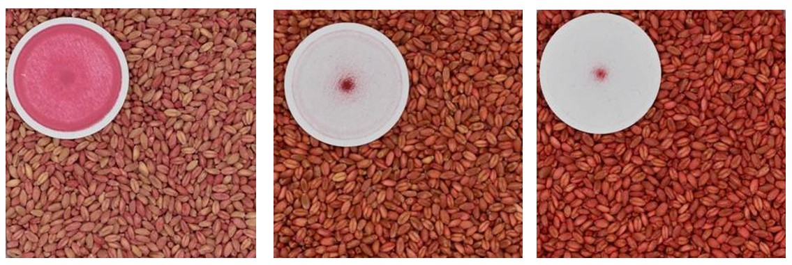 Left: A class 5 sample from the benchmarking program, illustrating uneven, inadequate coverage. Middle: A Class 3 ‘adequate sample. Right: A class 1 sample, with all seeds being treated and the same colour. With these samples, there’s also a correlation with dust-off, with the class 1 filter paper illustrating excellent (low) dust-off.