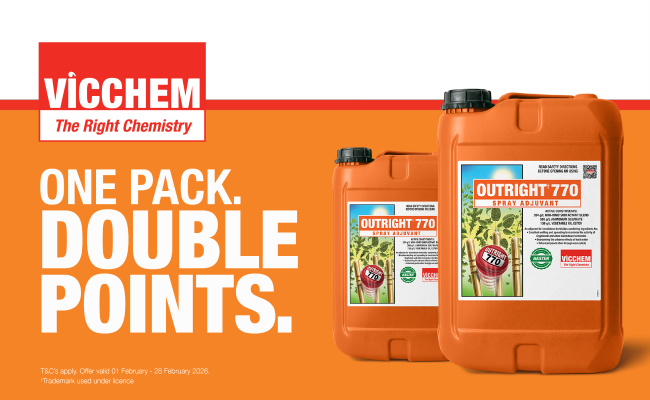 *The VICCHEM OUTRIGHT 770 (all pack sizes) double points points promotion is valid nationally to Nutrien Rewards Members. To be eligible for the double points offer, the Nutrien Rewards member must purchase VICCHEM OUTRIGHT 770 (all pack sizes) from any Nutrien Ag Solutions store that is part of the Nutrien Rewards Program between 01 February to 28 February, 2026 (inclusive) using their Nutrien Account. Points will be applied to the Member’s Nutrien Rewards account the following month. Please see Nutrien Rewards Terms and Conditions for more details.