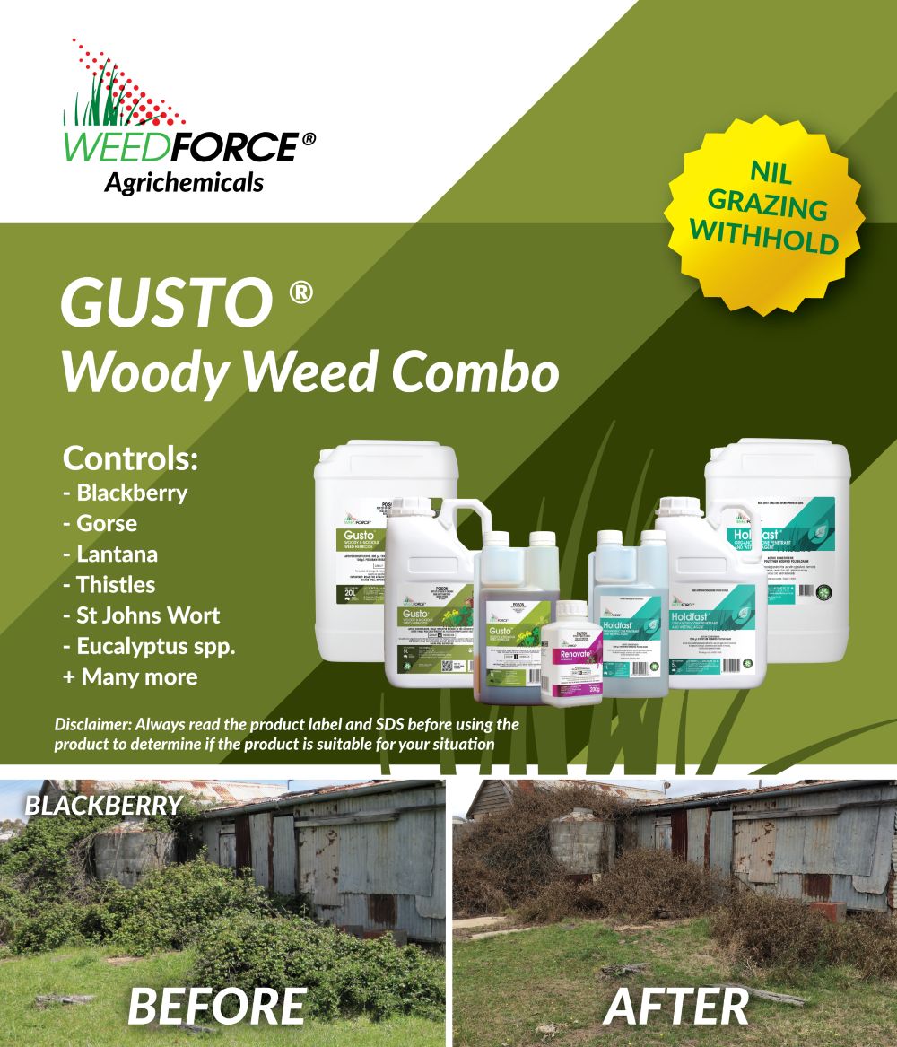 As with any agricultural chemical, always read and follow the Gusto, Renovate and Holdfast product labels before use. Used correctly, Gusto Woody Weed Combo offers a simple way to get on top of blackberry – and a long list of woody and noxious weeds – in one hit.